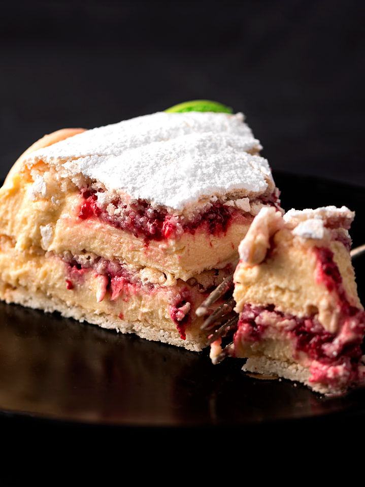 La Grand Macaron es una torta elaborada con grandes discos de macarons, rellenos con una suave crema de vainilla y frambuesas. Una experiencia deliciosa y refrescante en cada bocado.